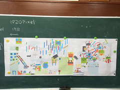 11月14日。私が暮らす地域の中心的存在「永吉小学校」で図工の授業を担当させてもらいました。いろいろと考えた末に「デジタル表現をアナログで」という課題を与えてみました。色のついた1センチの方眼紙(5色分)を与え、方眼(グリッド)以外の部分でカットすることを禁じた上でキャラクターを数体作らせます。これが一時限目。二時限目は、大きな方眼紙を教室の前と後ろにある黒板に貼りだし、それぞれが作り出したキャラクターに関係性を持たせてみました。この時もグリッドに沿って貼り付けることを指示しました。途中から制御が効かなくなり、最終的には斜めに貼り付けられていたりしますが、まあこれはご愛嬌・・・。